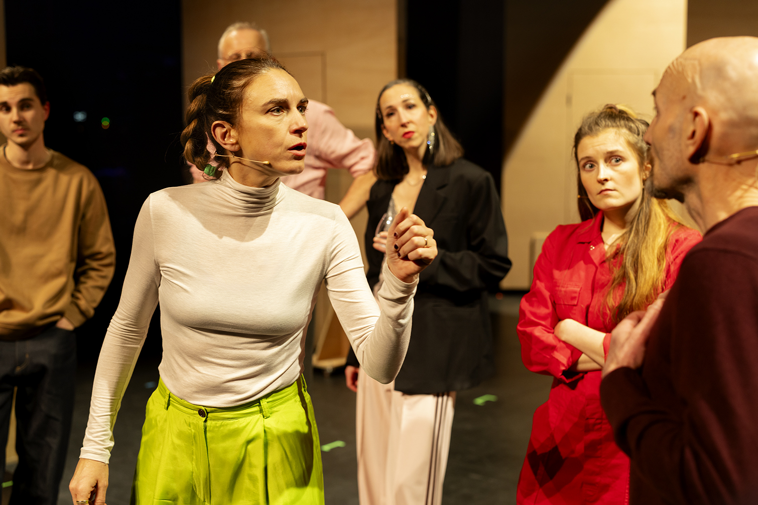 Wannes: “Op zulke momenten doen Julie en Sweder iets wonderlijks: ze vertragen en bevragen ons. We hebben dat gerecupereerd in het script van de voorstelling: de rollen van Julie en Sweder zijn een soort verderzetting en intensivering van de rol van de jongste generatie in DE SITCOM. Toen waren ze de crew die de gebeurtenissen op de filmset in goede banen leidde, in DE SITCOMEBACK begeleiden ze de groep naar een beter begrip van elkaar en zichzelf.”
