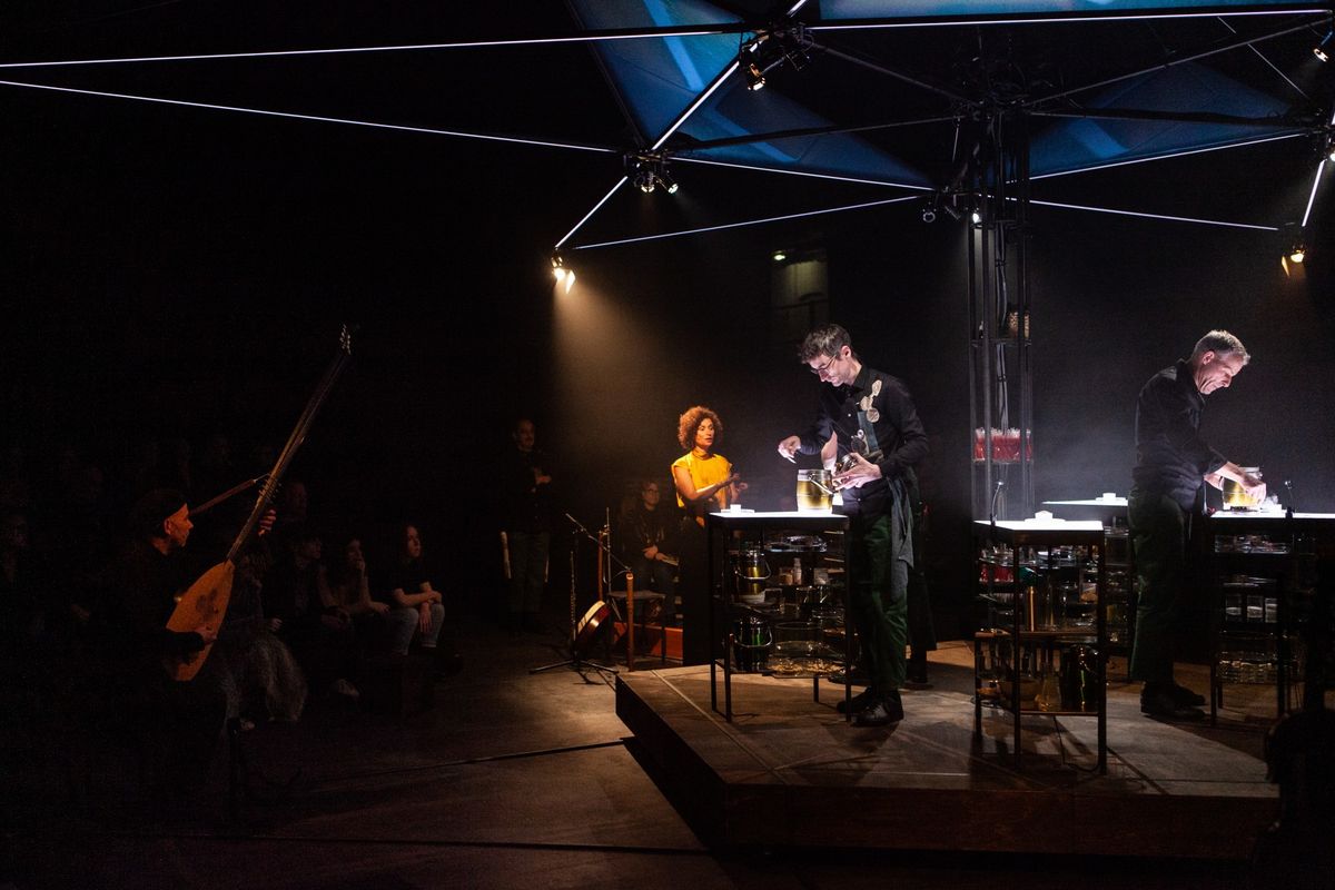 De toeschouwers zitten in een pentagram om de muzikanten en alchemisten heen. Deze opstelling gaat terug op de oeroude vorm die refereert naar het idee van kwintessens en vijf elementen. Een vorm die welbekend is bij alchemisten. Terwijl de muziek weerklinkt: repetitieve akkoorden die zich bescheiden ontwikkelen, over elkaar heen buitelen en als een waterval exploderen in speelsheid, kracht en tempo zijn de toeschouwers getuige van allerlei experimenten waarbij bepaalde krachten aan het werk zijn. Ingrediënten worden omgezet in iets anders, via een alchemistisch proces van distillatie of gisting. Vloeibaar wordt vast, nat wordt droog, koud wordt heet en omgekeerd. Olie stolt druppelsgewijs tot eetbare parels. Een bloemkoolknopje op je tong geeft een elektrische sensatie. De interventies raken aan het botanische en het kosmische, folklore en orale tradities, oude en hedendaagse mythes.