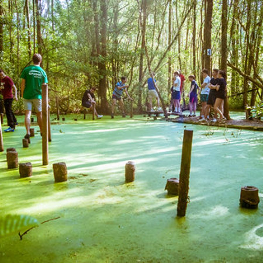 Moerasparcours: Een uitdagende tocht over verschillende obstakels boven ons moeras. Wie blijft er droog? En wie durft het meeste uitdaging aan te gaan?