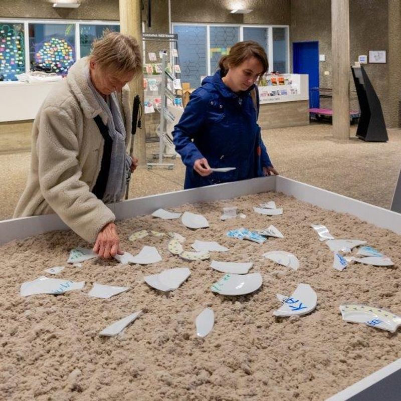 De scherven worden niet zomaar achtergelaten. Ze worden verzameld, opgepikt en gelegd op een bed van zand. Een tijdelijk mozaïek ontstaat. Elke scherf vertelt een verhaal. De breuklijnen worden overgebracht op stof en verder uitgewerkt in borduurwerk. Zo ontstaat een innerlijk landschap van wat is doorleefd.