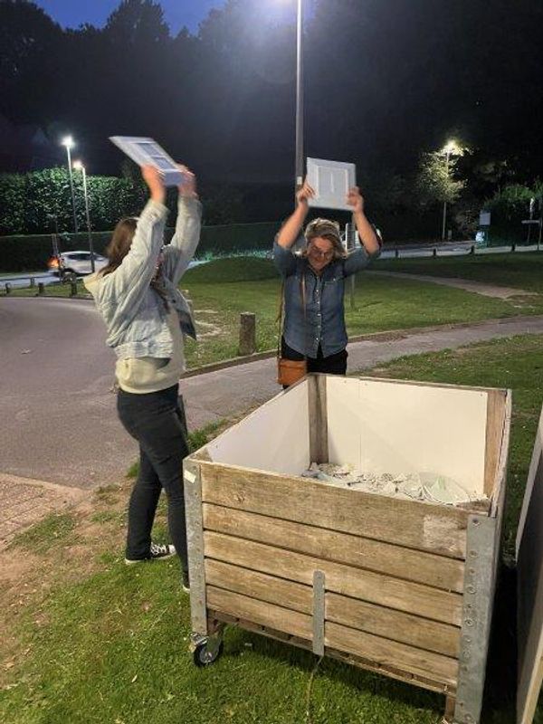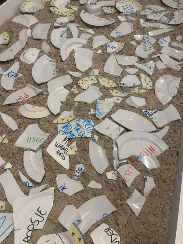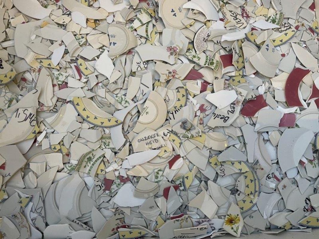 De eerste 2 fases breken en leggen vormen een nieuw ritueel dat we installeerden bij elke eerste genrevoorstelling van het seizoen. Aan de ingang van Westrand nodigden we bezoekers uit om ‘iets’ achter te laten: een gedachte, een zorg, een eigenschap, een moment. Je neemt een bord, schrijft erop wat je wilt loslaten en gooit het bord dan aan stukken. Je laat dat ‘iets’ achter en maakt zo ruimte voor iets anders. Daarna neem je een scherf legt die in een kader. Zo ontstaat, scherf na scherf, een mozaïek.