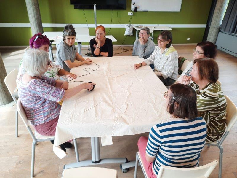 Deze mozaïek vormt de basis voor een groot borduurwerk. Samen met een vaste groep naaivrijwilligers en wisselende deelnemers van diverse leeftijden en achtergronden - uit een WZC, Fedasil, een lagere school…- werken we aan het kunstwerk doorheen het seizoen.