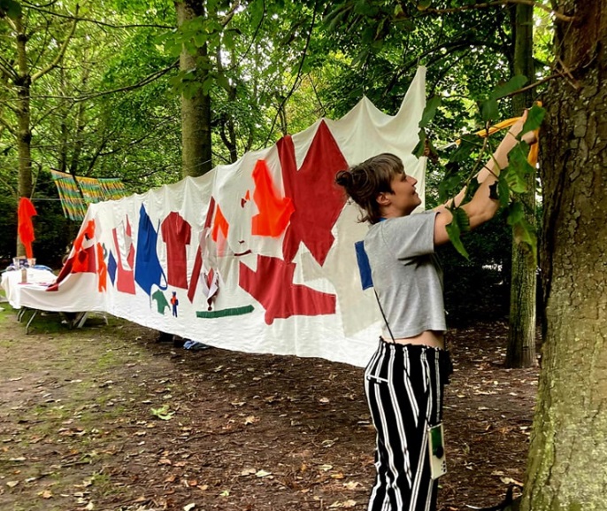 Saar: “Ik kies voor een participatieve kunstpraktijk vanwege het gezamenlijk creëren, het delen van verhalen en om maatschappelijk iets in beweging te brengen. Textiel is daarbij een emotionele drager, een middel om collectieve herinneringen en verhalen binnen een gemeenschap of familie vast te leggen. Kortom ik zie het als culturele textieluitwisselingen en dierbaar textiel, waarbij textiel het medium is om dieper in een familiegeschiedenis te duiken en lokale gemeenschappen te verkennen.”