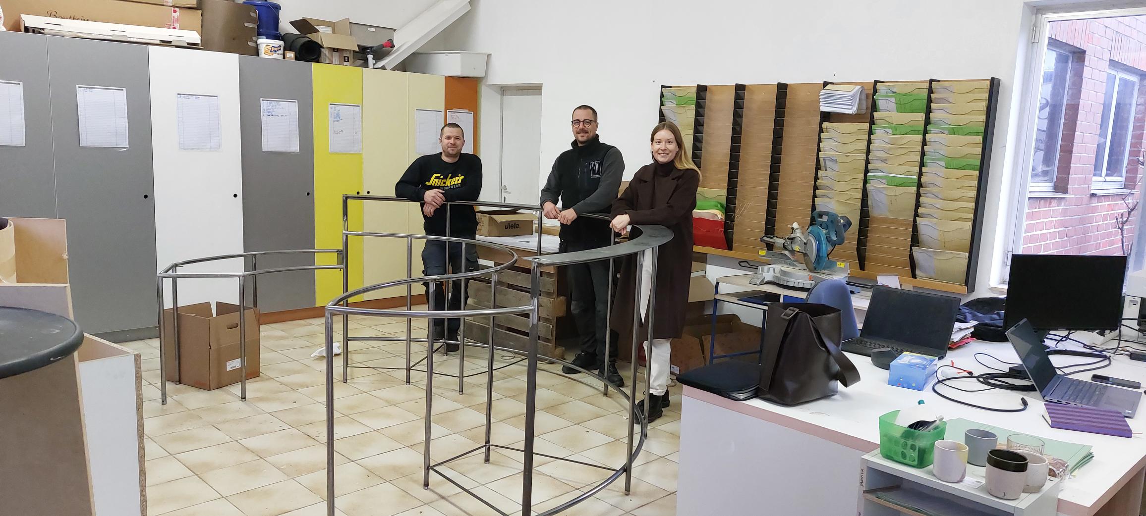 Yannick: Alles is gebogen, zowel de stalen structuur als de kasten. Daarnaast moest de verankering in het plafond zo onzichtbaar mogelijk gebeuren. Het is echt geen alledaags project.